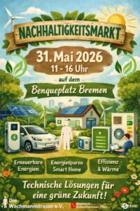 Am Sonntag, 31. Mai 2026, wird der Benqueplatz in Schwachhausen zum Treffpunkt für alle, die sich über nachhaltiges Wohnen, Energie und Klimaschutz informieren möchten. Von 11 bis 16 Uhr findet dort erstmals ein Nachhaltigkeitsmarkt für Schwachhausen statt. Im Mittelpunkt der Veranstaltung steht die Wärmewende – also die Frage, wie Gebäude künftig klimafreundlich und gleichzeitig bezahlbar beheizt werden können.